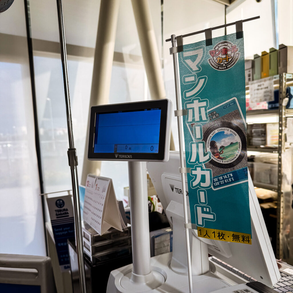 令和7年にオープンした道の駅「湘南ちがさき」で配布しているマンホールカードは1階のサービスカウンターでもらえます。目印は掲げられているマンホールカードの小旗です。
